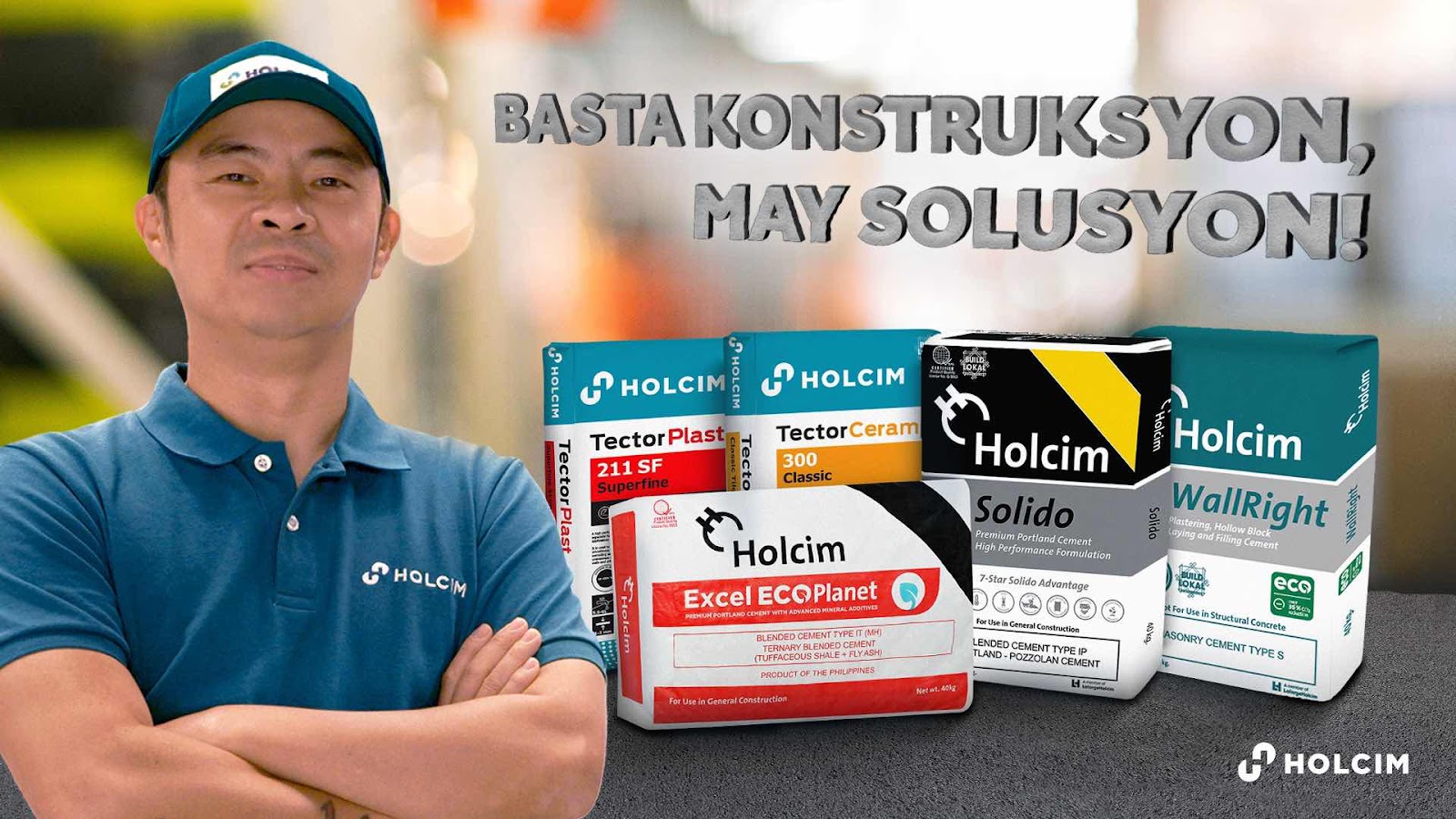The commercial features a diverse array of Holcim's innovative building solutions. Leading the pack is Excel ECOPlanet, an environmentally friendly cement specifically formulated for homes and low-rise buildings. For infrastructure and road projects, Solido is the ideal solution. The lineup also features specialized building solutions like Optimo, the sustainable cement for high-rise building projects, and WallRight, a high-quality masonry cement. Lastly, Holcim introduces its new skim coat and tile adhesive product lines, TectorPlast and TectorCeram.