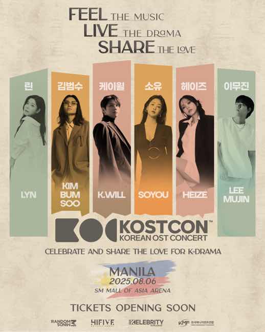 KOSTCON 2025 is made possible by Random Minds, the premier company behind some of the biggest and most unforgettable concerts in the Philippines. In collaboration with global partners Hi-Five Entertainment Sdn. Bhd. and Kelebrity Worldwide Inc., Random Minds is thrilled to bring this full-scale K-drama OST concert right to the heart of the Philippines.
