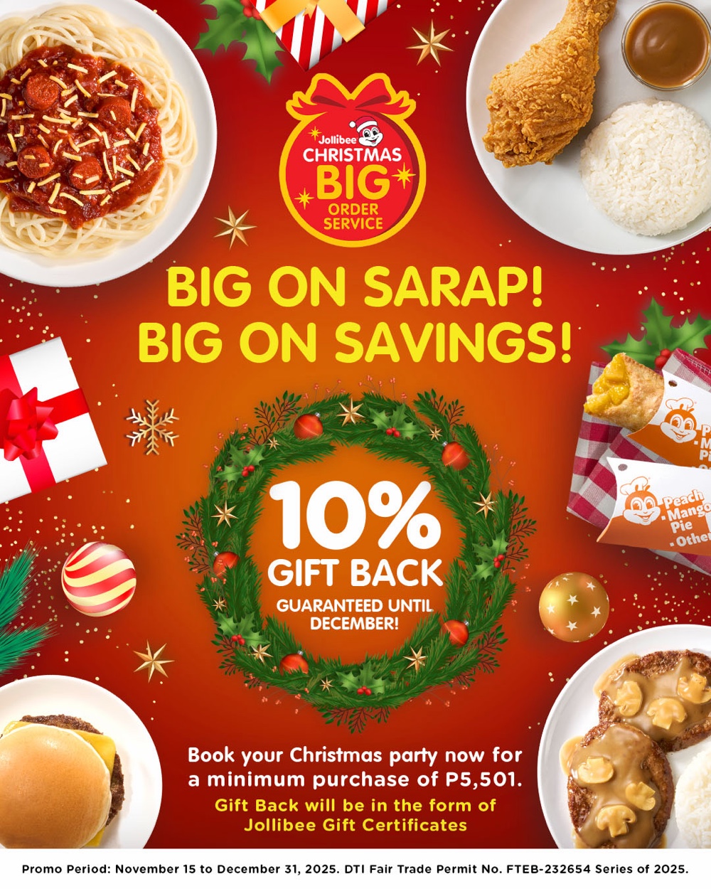 Inside the stores, customers can get their hands on the Christmas Bundle, available nationwide for ₱399, which includes a collectible Jollibee Bag Charm and items like Chicken Fillet with Pepper Cream Sauce and Jolly Spaghetti, offering a festive treat for the whole family. Promo runs until December 31, 2025.